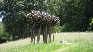 Decidiamo per effettuare la pausa barretta & panino presso il ristorante Carlon. Riprendiamo, ma dopo poche centinaia di metri ci fermiamo all'entrata della Malga Costa, dove tre del gruppo vanno a visitare la parte a pagamento del parco col le sculture più interessanti. Dopo un'oretta di attesa ripartiamo, breve salita sempre nel bosco e poi comincia la discesa. Purtroppo solo le vedute panoramiche sul lago di Levico salvano la (mia) bocciatura per questa discesa su strada inghiaiata e ripida con tratti in cemento... le detesto...